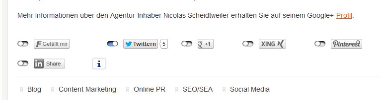 In diesem Blog nutze ich das Plugin “2 Click Social Media Buttons”. Das Plugin berücksichtigt auch die Forderung von Datenschützern. Denn die Social Plugins speichern Daten der Besucher. Durch die Zwei-Klick-Lösung muss der Leser die Social Plugins erst selbst aktivieren. Insofern stimmt der Datensammlung des Anbieters zu.