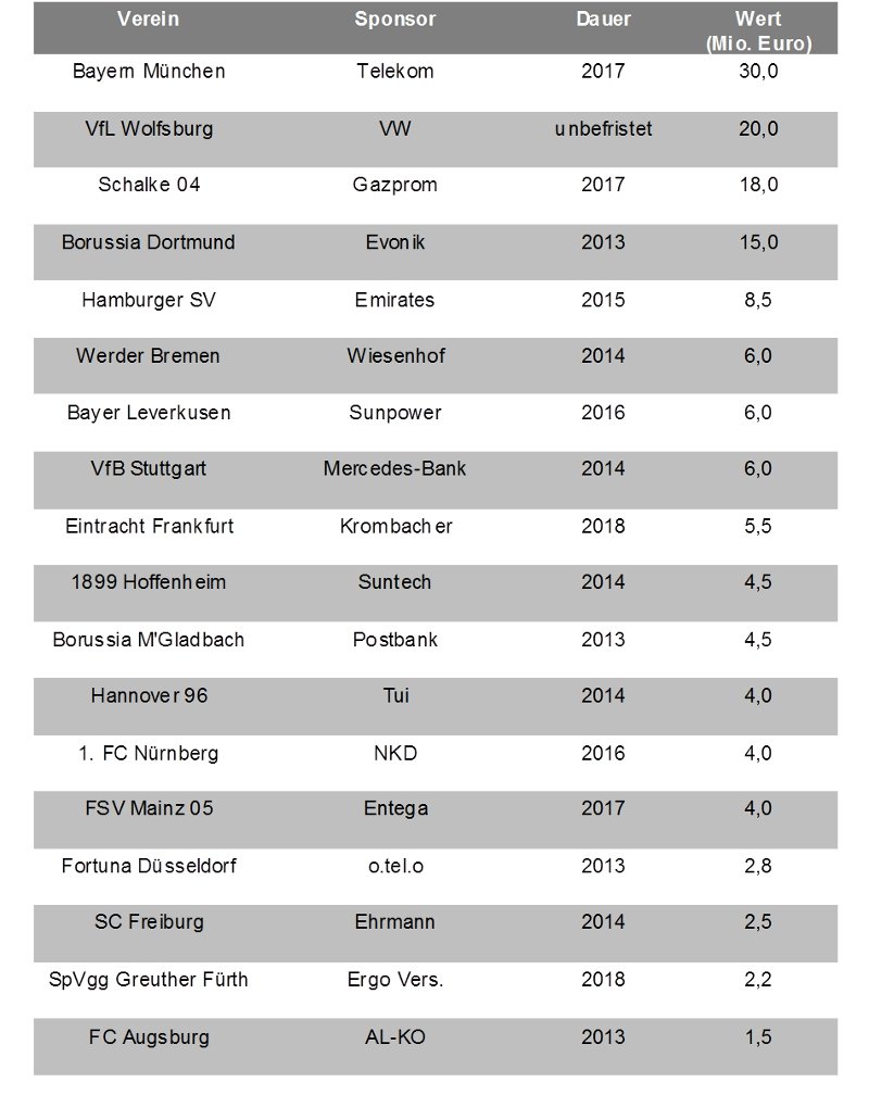 In der folgenden Tabelle stellen wir die Clubs und ihre Sponsoring-Partner vor. Die Zahlen sind teilweise geschätzt und auch erfolgsabhängig: